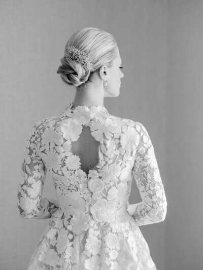 “I have always had a classic style, going back to my childhood obsession with Old Hollywood movie stars like Grace Kelly and Audrey Hepburn,” Samantha says. “I chose an Oscar de la Renta gown that reflected that but with a modern twist in the details; it was the second dress I tried on. For the reception, she changed into a blue tulle Monique Lhuillier dress that also served up Old Hollywood vibes. “We added a bright blue petticoat to give it that 1950s glamorous feel and a pop of color,” Samantha says. “I had so much fun in that dress.”