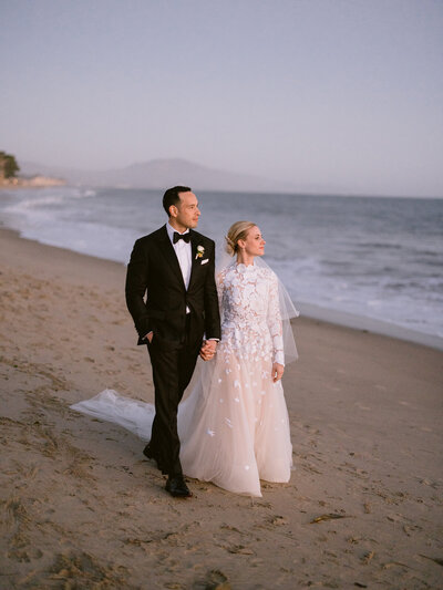 “The odds were against us in so many ways,” says Samantha Grody about her relationship with Galo Sanjinez. “And yet, here we are.” Samantha is a comedian, but she used to work in auto finance—with Galo. “We dated for a little more than two years before getting engaged, but one of these years was kept a secret, during Covid, since we weren’t allowed to date due to work.” Love prevailed, and finally, Galo proposed at the Orange County Museum of Art. “I was overwhelmed with happiness and said yes before even looking at the ring,” Samantha says. “We were looking for a venue that felt residential and cozy, and Rosewood Miramar Beach in Montecito checked both the boxes,” Samantha says. “I was struck by how much the architecture and decor reminded me of the home I grew up in. It’s reminiscent of the style of Paul Williams, a true reflection of Southern California elegance.”